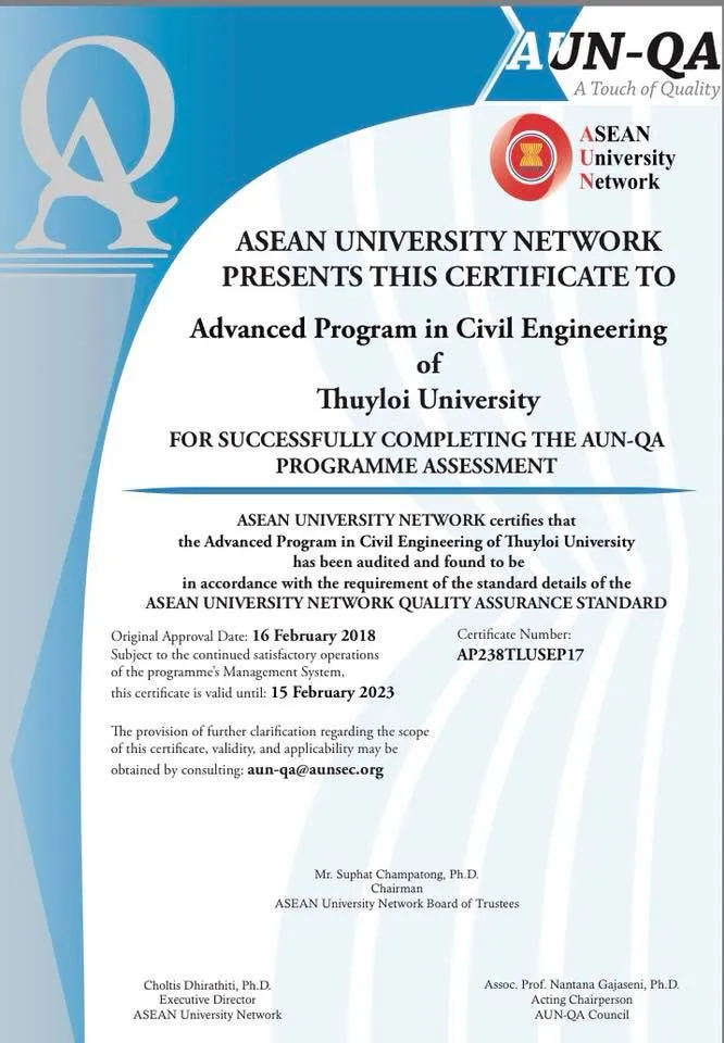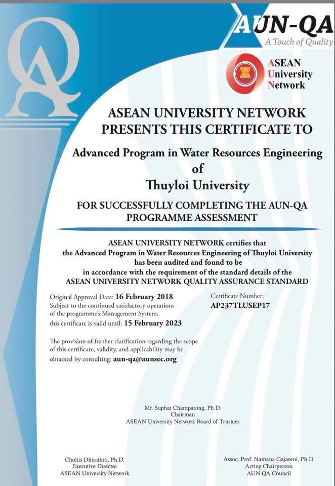 [SIE] Hai chương trình tiên tiến của Trường Đại học Thủy Lợi hợp tác với hai trường Đại học đối tác Hoa Kỳ (CTTT ngành Kỹ thuật xây dựng hợp tác với ĐH Arkansas và CTTT ngành Kỹ thuật Tài nguyên nước hợp tác với ĐH bang Colorado) đã được cấp chứng chỉ kiểm định quốc tế AUN (Mạng lưới các trường Đại học thuộc Hiệp hội các quốc gia Đông Nam Á- ASEAN).