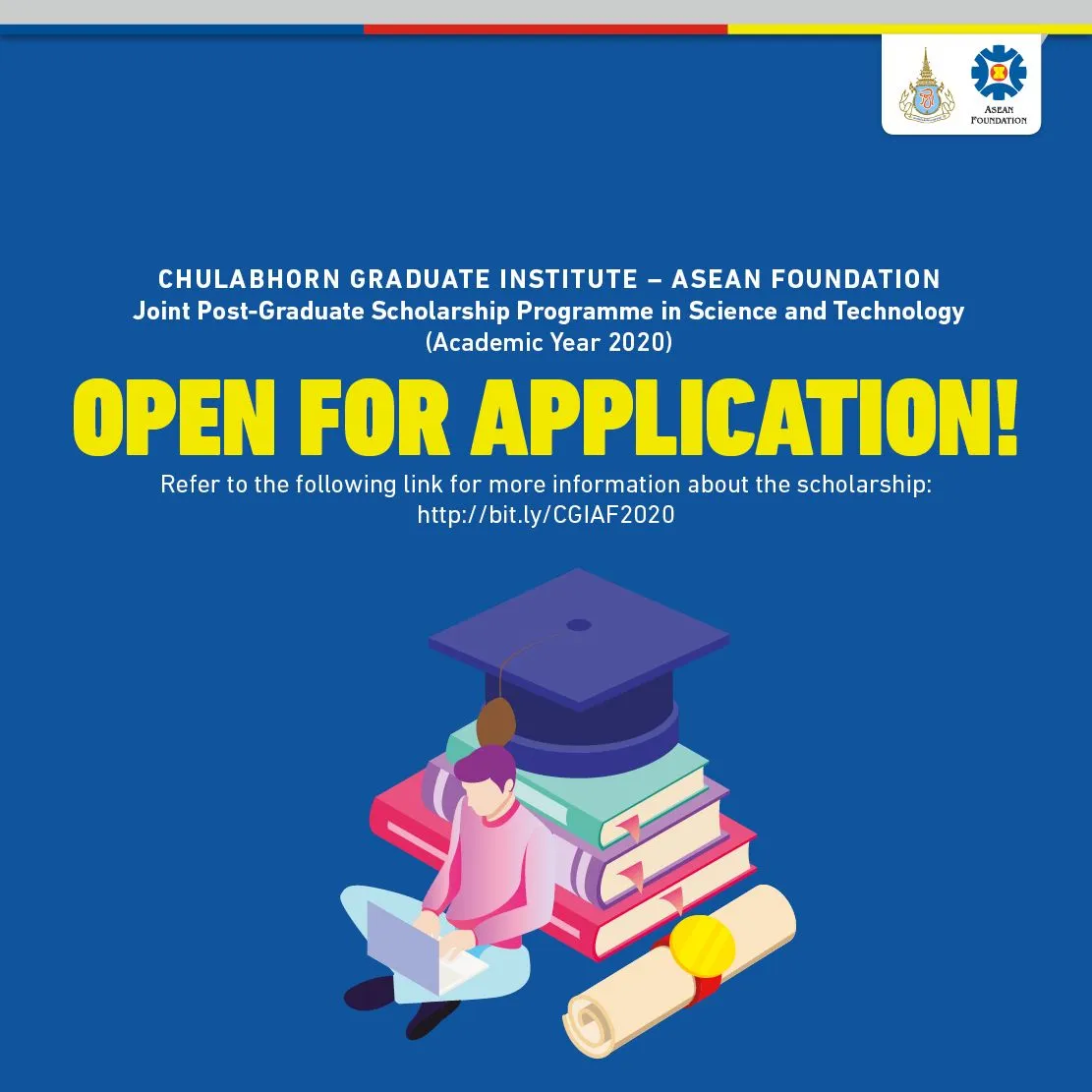 The purpose of this scholarship program is to develop highly qualified human resources in the area of science and technology within ASEAN Member States. This year, 10 scholarships are available to ASEAN nationals (except Thai citizens) who are interested to pursue a Master’s Degree at the CGI. Further details regarding this scholarship program are described in the attached document, including eligibility criteria and application process. For any inquiries, please refer to Page 4 of the document to directly contact the CGI or the AF.