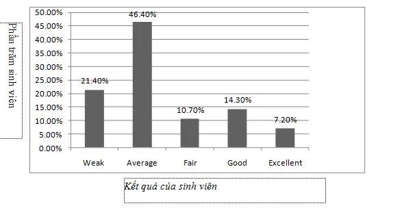 Gần 50% số sinh viên đạt điểm trong khoảng 5-6,9, sau đó là tỷ lệ học sinh yếu (21,4%) trong khi số điểm khá, tốt, và xuất sắc chỉ chiếm lần lượt là 10,7%, 14,3%, và 7.2 % (Biểu đồ 2). Nhìn chung, năng lực ngữ pháp của sinh viên là tương đối thấp với tổng số 67,8% sinh viên.